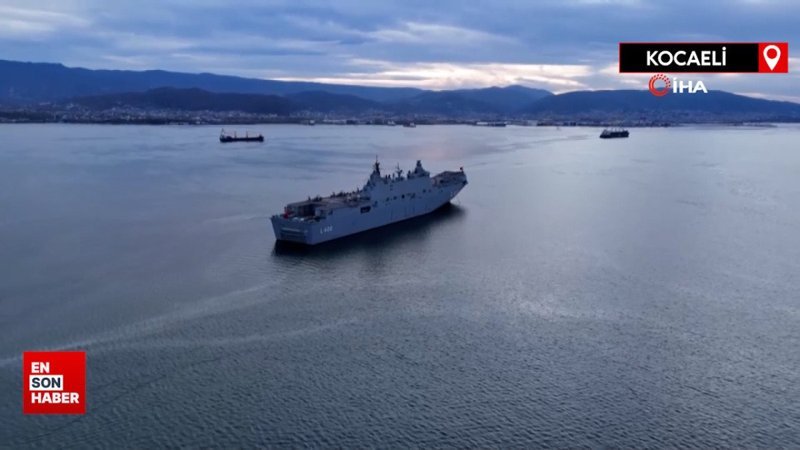 İzmit Körfezi'nde demirleyen Türkiye'nin en büyük askeri gemisi 'TCG Anadolu' tüm heybetiyle havadan görüntülendi.