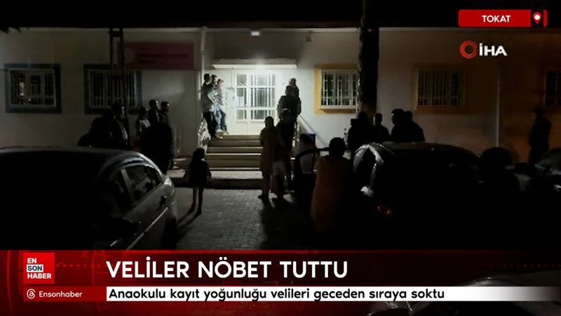 Tokat’ta bir anaokuluna çocuklarını kaydettirmek isteyen veliler, sabah yapılacak kayıtlar için gece okul önünde sıraya girerek nöbet tuttu.