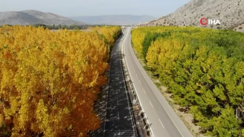 Tokat’ta sararmış yapraklar ile sarının tonlarına bürünmüş yoldan geçenler hızlarını düşürerek manzaranın keyfini çıkartıyor.