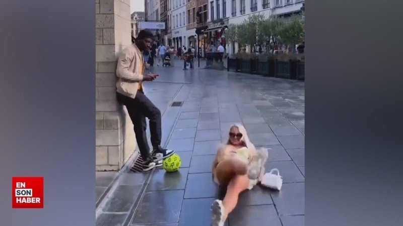 Bu talihsiz kadın, önüne gelen topa vurmaya çalışırken düşüyor.
