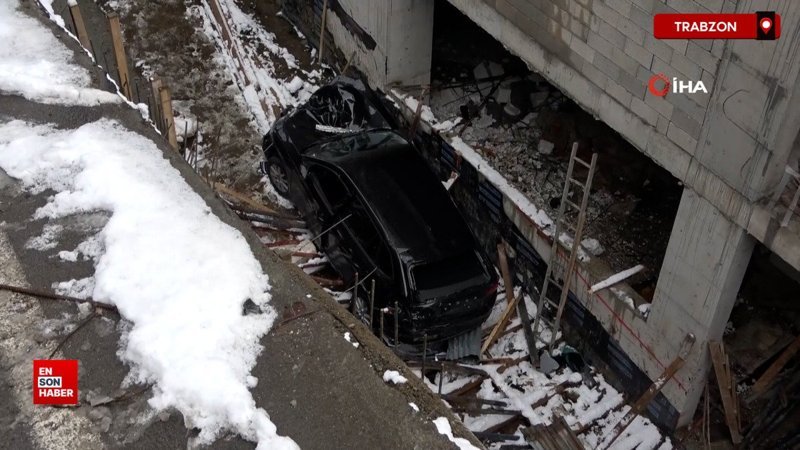 Trabzon'da etkili olan kar yağışı sonrası buzlanan yolda kayan bir otomobil, inşaat halindeki binanın zeminine düştü. Otomobil sürücüsünün yaralandığı kaza güvenlik kamerasına yansıdı.