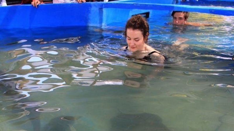 Balıkesir'in Edremit ilçesine gelen turistler, 40 tonluk akvaryum şeklindeki havuzda, 21 köpek balığı ve 12 büyük vatozla yüzebiliyor.