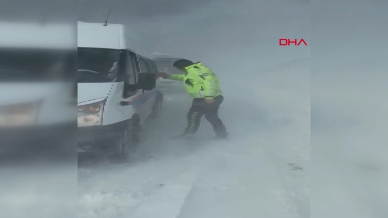 Van'da tipide öğrenci servisini iten trafik polisinin zor anları.
