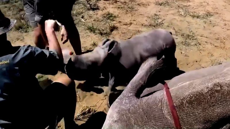 Yavru gergedan, doktorların annesine zarar verdiğini düşünüyor ve onu korumaya çalışıyor