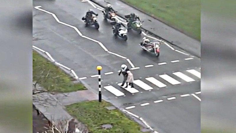 İskoçya Irvine'de yaya geçidinde bekleyen yaşlı kadını karşıdan karşıya geçiren motosiklet sürücüsü