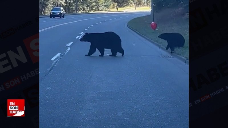 Yol kenarında bulduğu balon ile oynayan yavru ayı